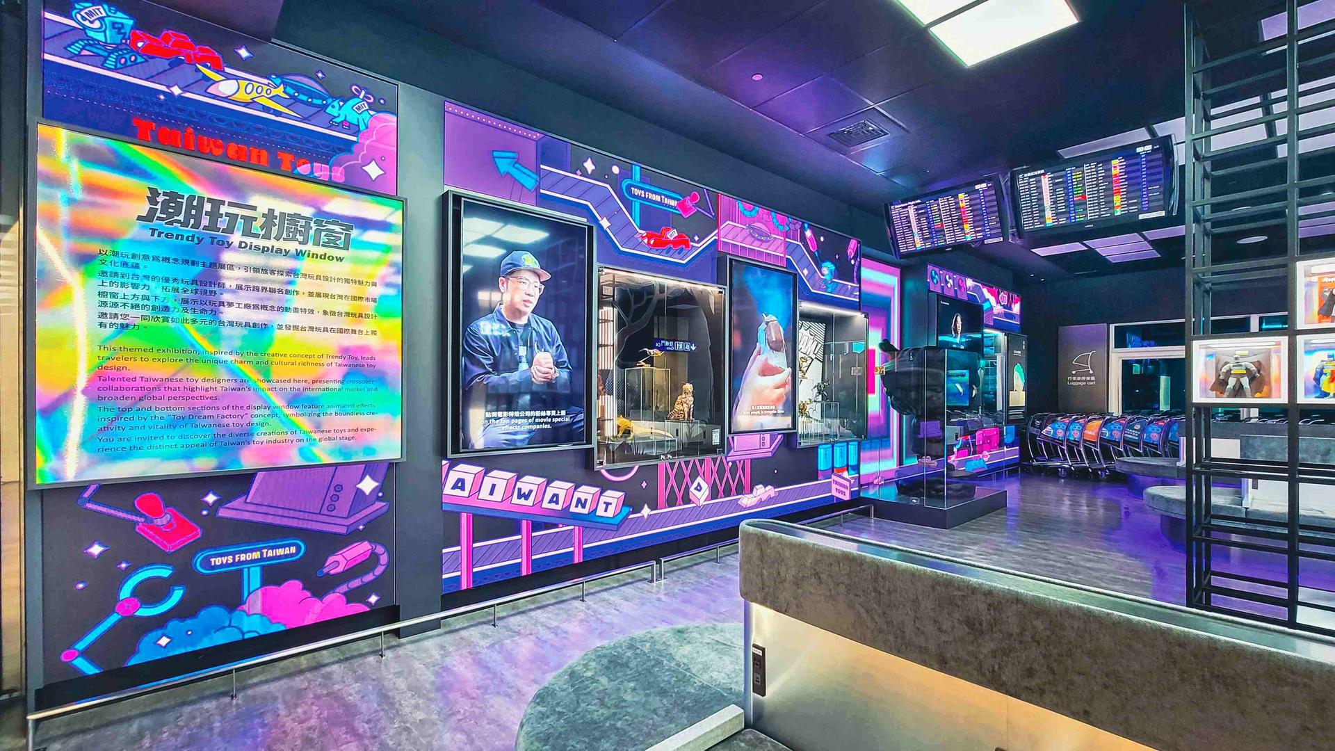 在風格上,我們也以黑色為底、藍紫色為主色,搭配螢光色點綴,這樣 明亮、高對比的配色,營造賽博龐克的潮酷氛圍,吸引路過與等待無聊的旅客觀看。